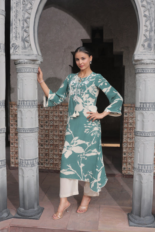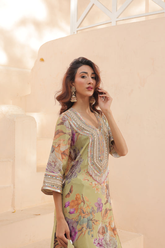 Floral Scarf Kurta - Green