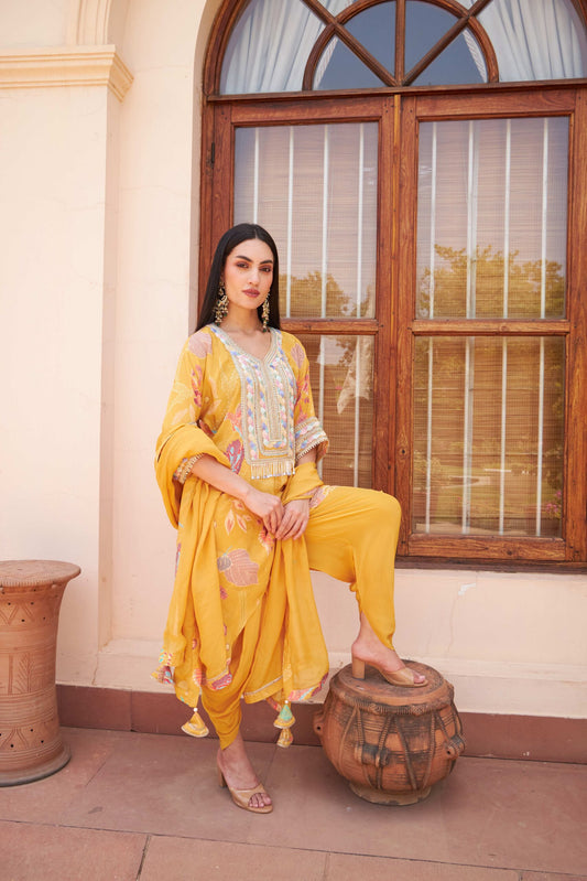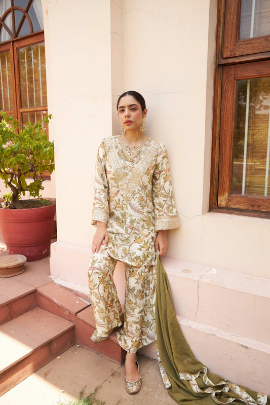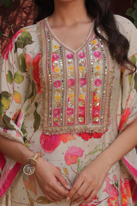 Floral Scarf Kurta - Beige