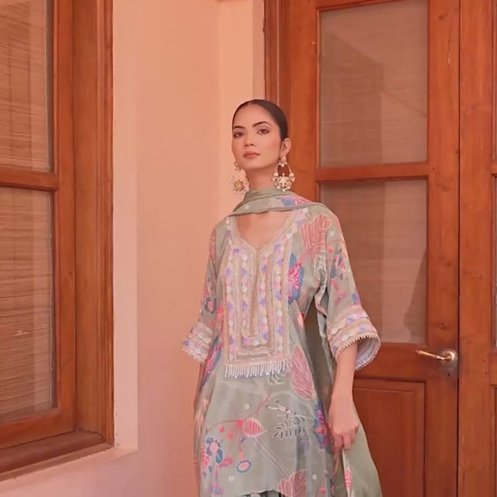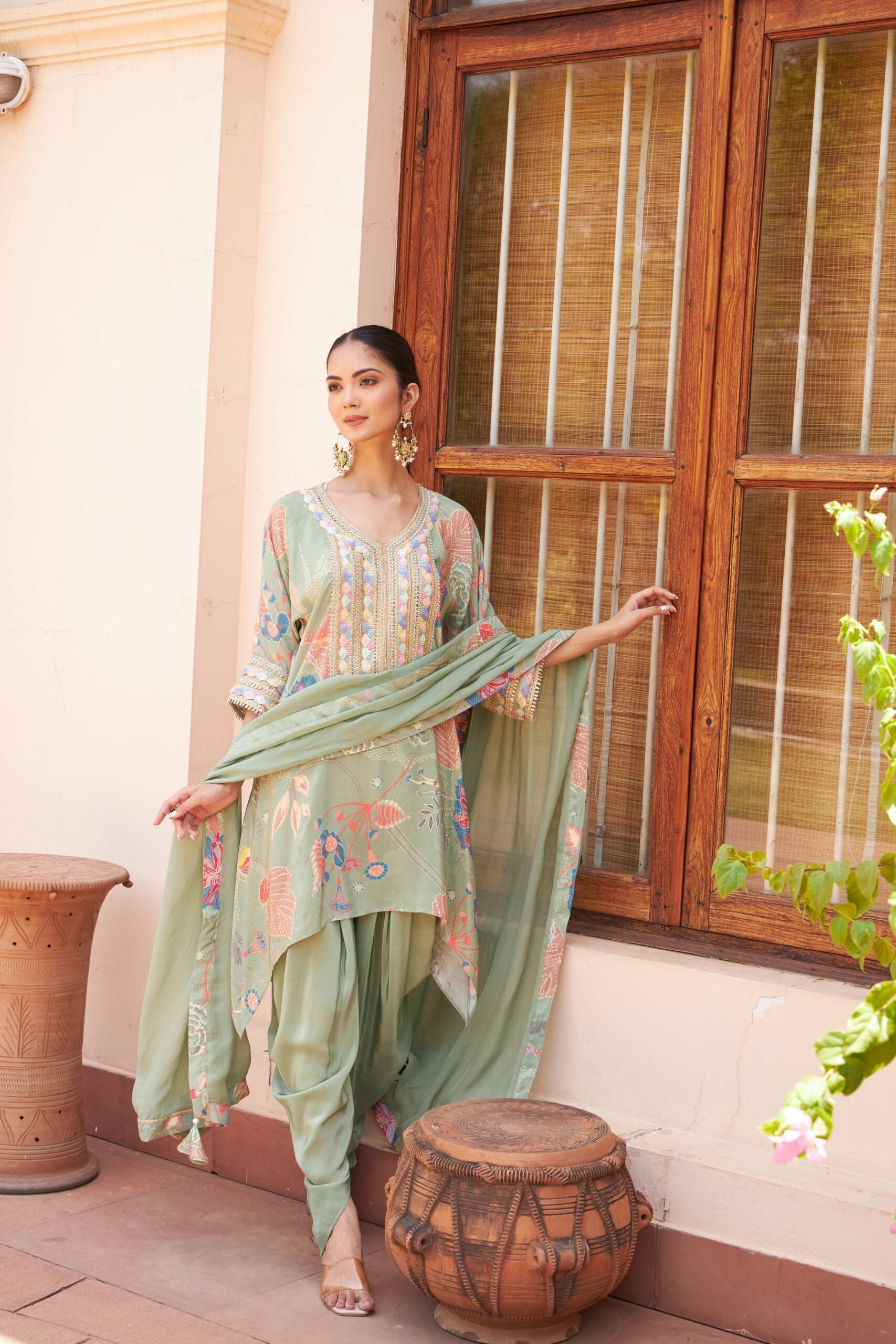 Elevate your style with this pista green printed tonic, featuring a chic C-cut hemline and exquisite hand embroidery with lace work. Paired with a matching dhoti and a soft organza dupatta, this ensemble combines traditional elegance with modern sophistication, perfect for making a statement at any event.