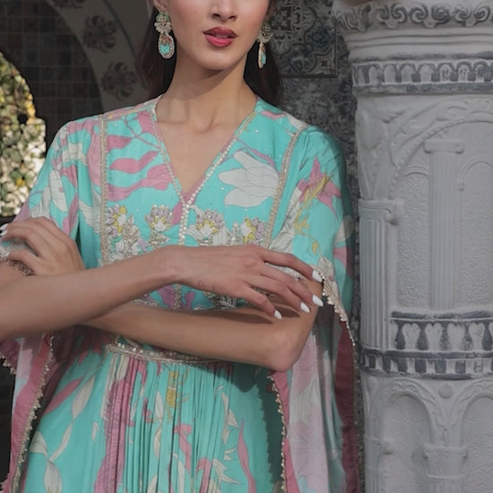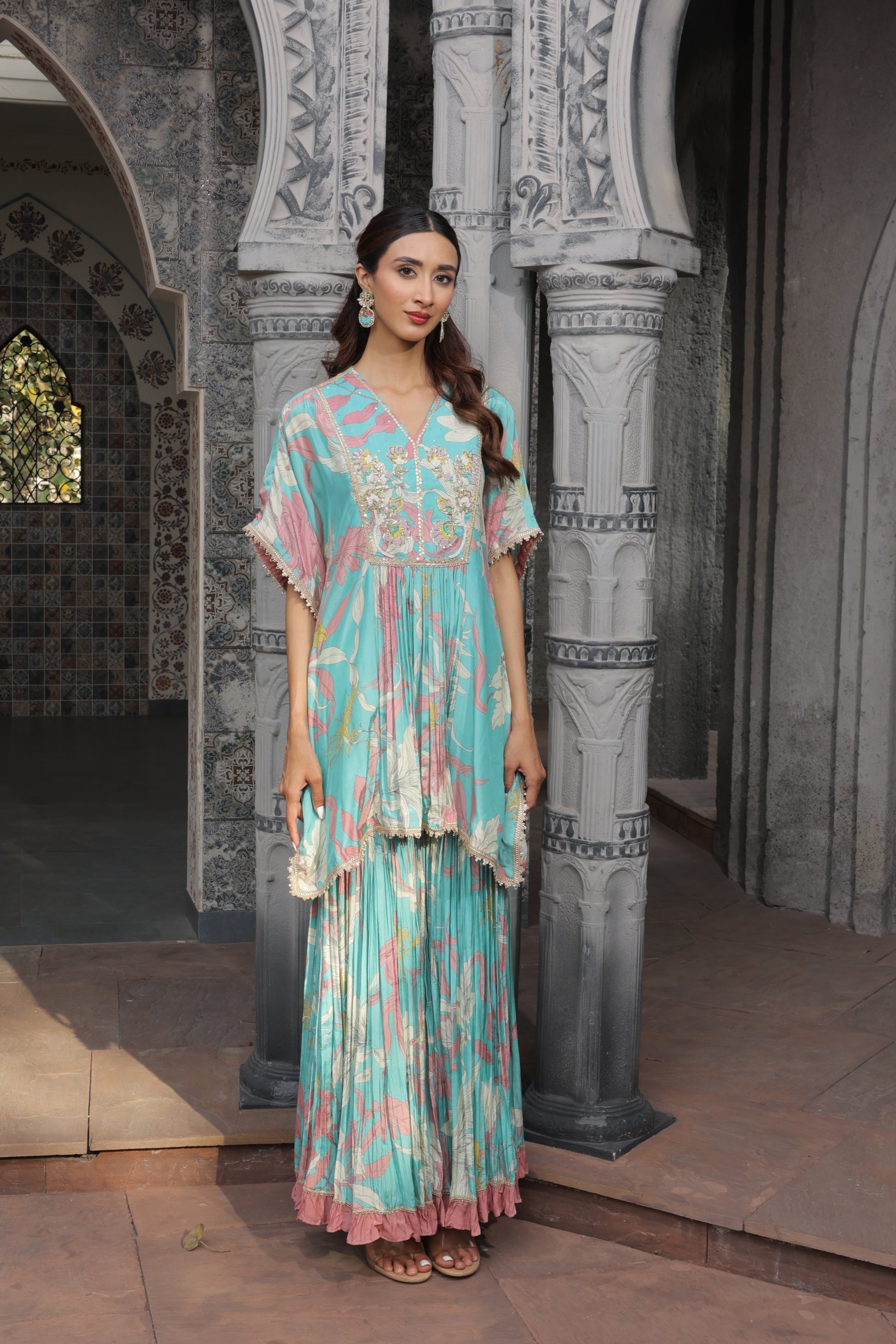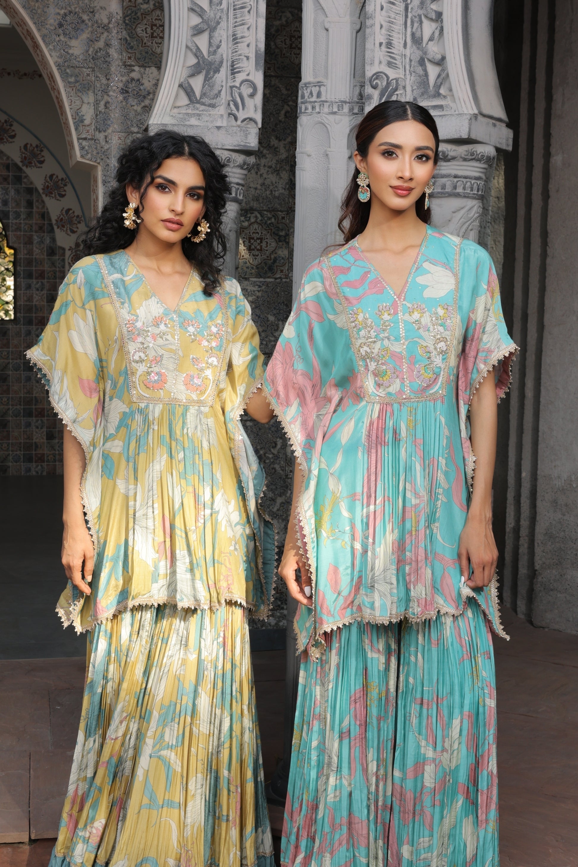 The Inaaya Kaftan Sharara Set is a harmonious fusion of modern and traditional styles, featuring a relaxed kaftan paired with a beautifully draped sharara for ultimate comfort and grace.