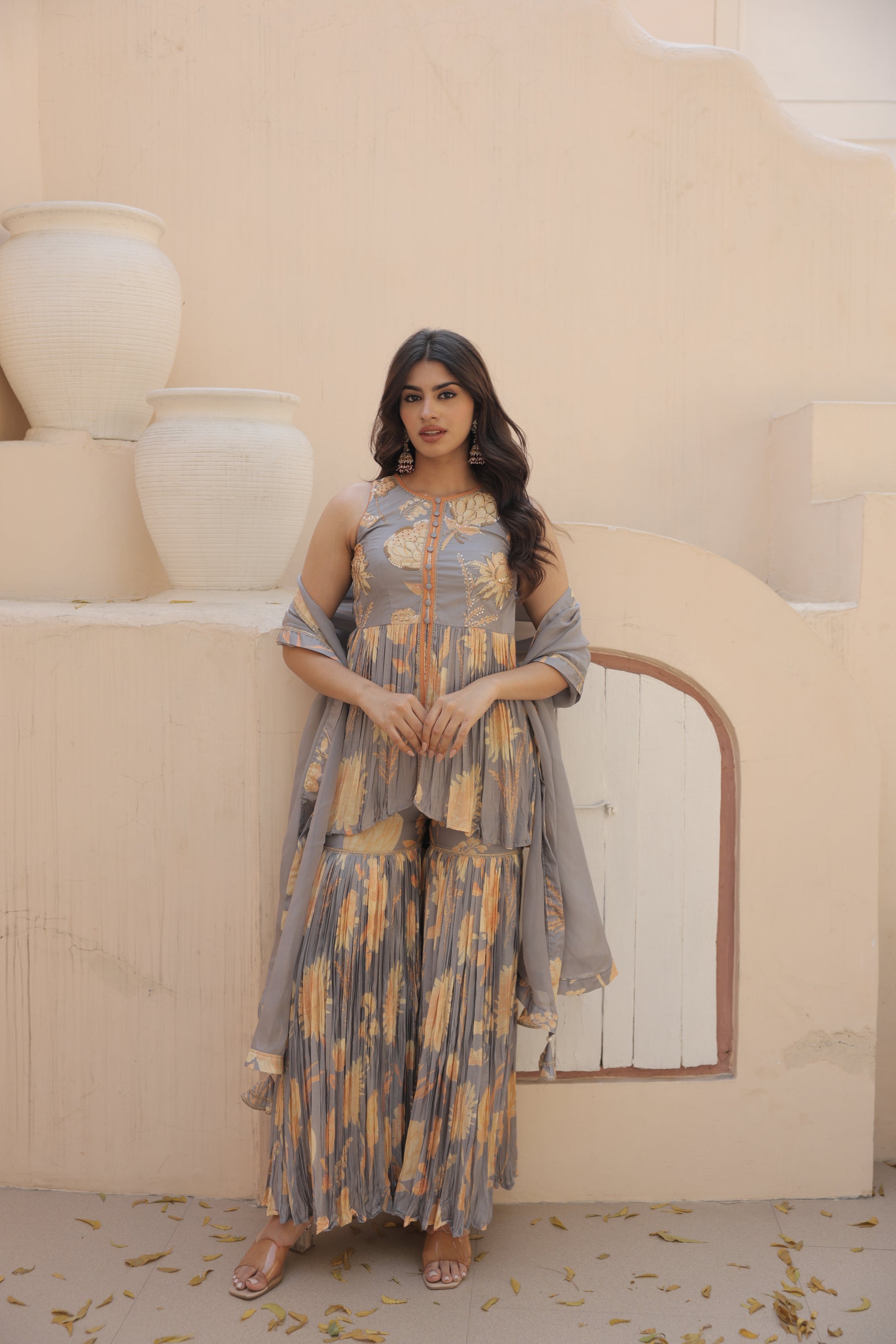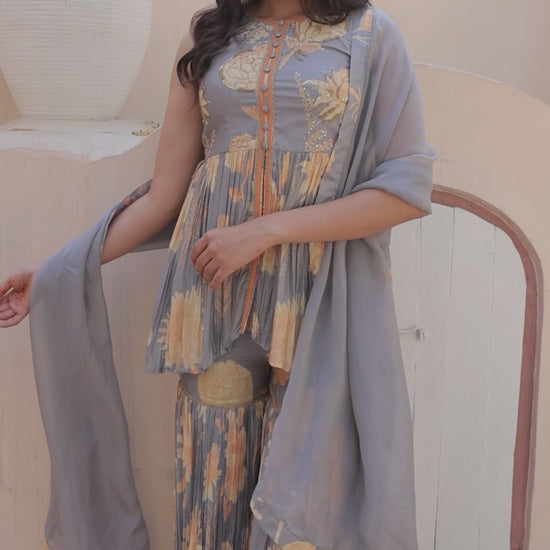 The Ira Dahlia Peplum Sharara Set offers a luxurious blend of classic peplum and sharara styling, enhanced with delicate dahlia designs for a festive, feminine touch.