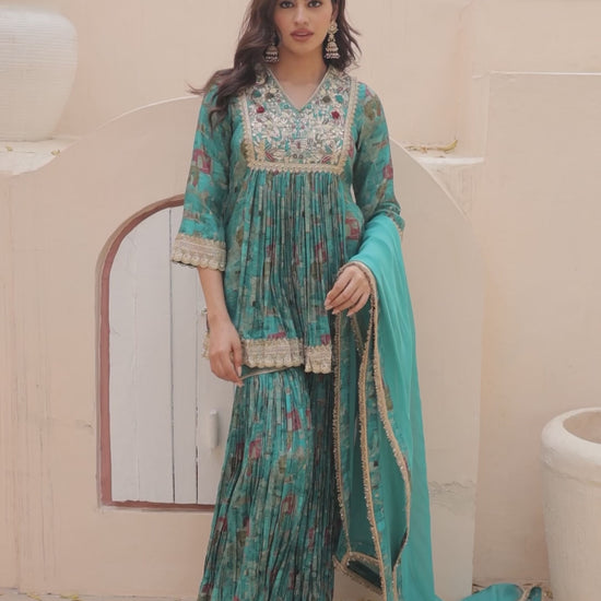 The Iris A-line Peplum Sharara Set combines classic peplum styling with an A-line cut, making it the perfect choice for anyone seeking both comfort and beauty in their festive look.