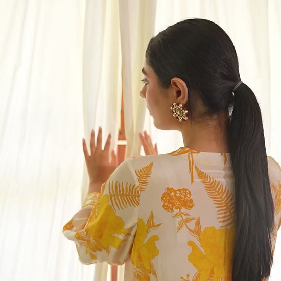 Elevate your style with our white & yellow printed long A-line kurta set, featuring a flattering C-cut hemline. Adorned with intricate hand embroidery on the neckline and sleeves, this ensemble exudes elegance and charm. Perfect for both casual outings and festive occasions, it offers a blend of comfort and sophistication. Embrace the beauty of traditional craftsmanship and modern design with this versatile outfit, ideal for those who seek refined and timeless fashion statements.