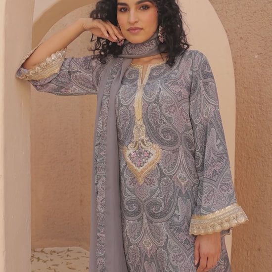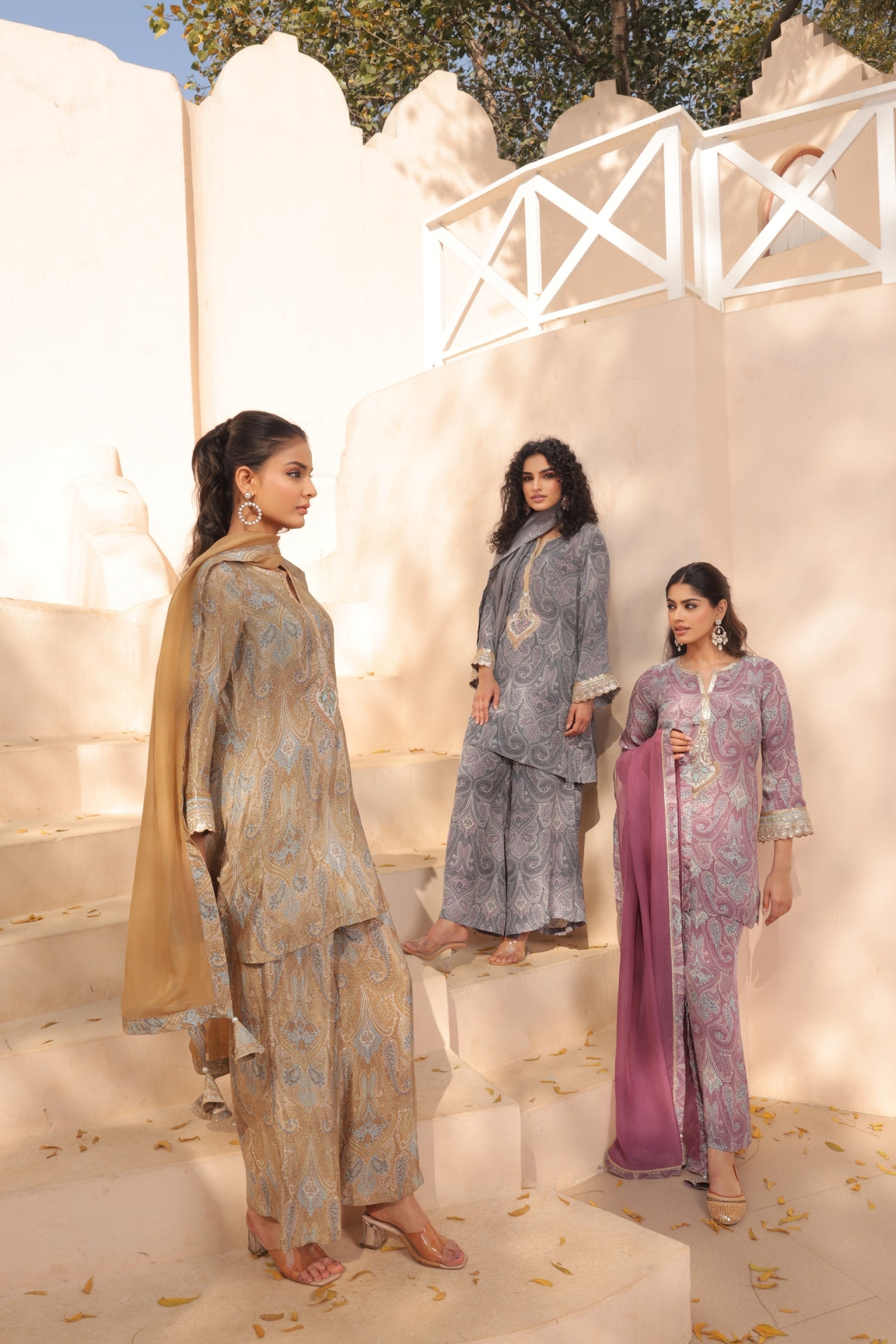 The Nalina Paisley A-line Peplum Sharara Set brings together traditional paisley prints with a flattering peplum cut, giving you a classy yet modern appearance.