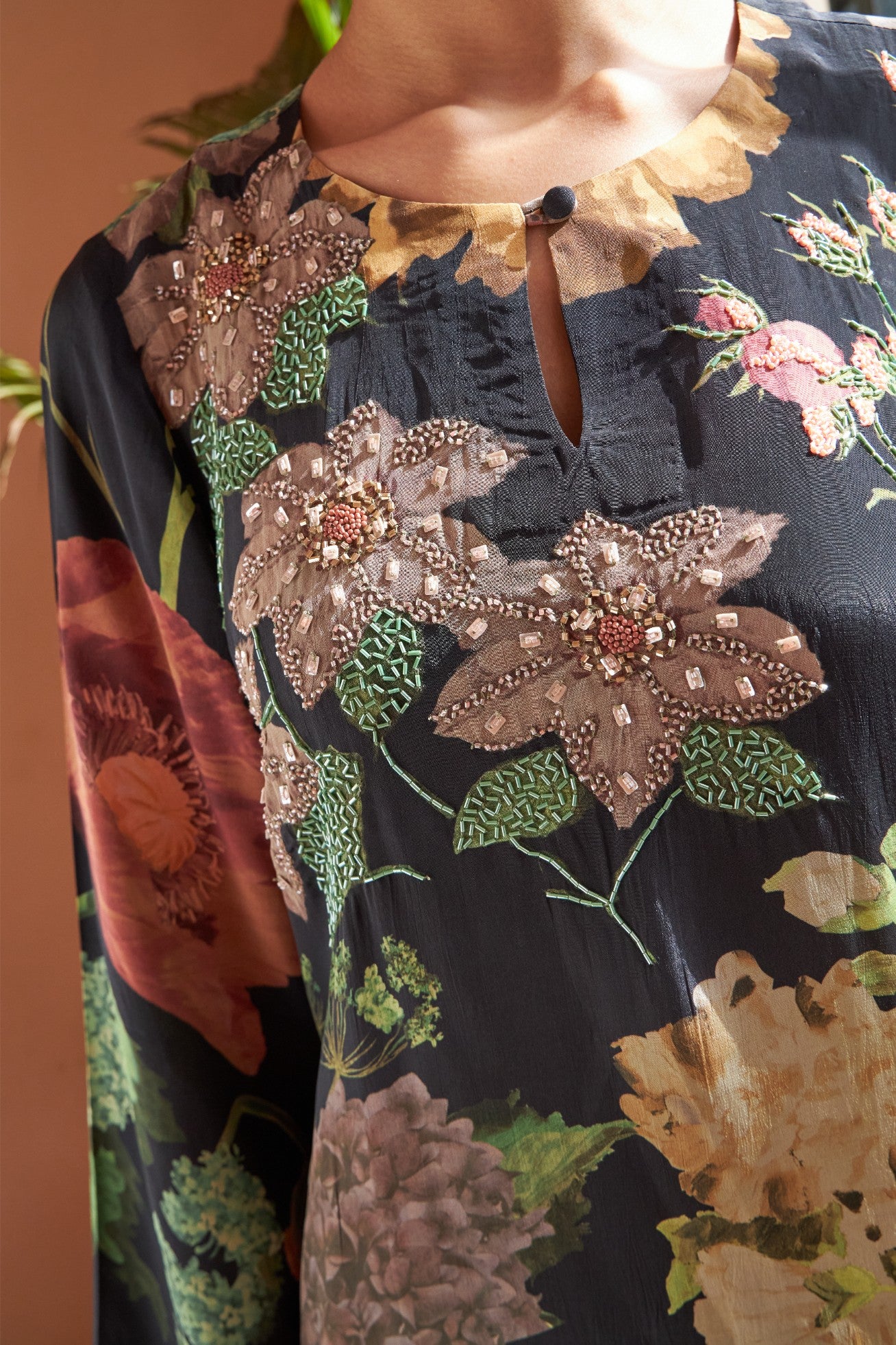Make a statement with this black floral printed coord set, featuring intricate hand embroidery for a touch of elegance. The pleated bell sleeves add a dramatic flair, blending classic design with contemporary style. Perfect for various occasions, this set offers sophistication and unique detailing for a standout look.