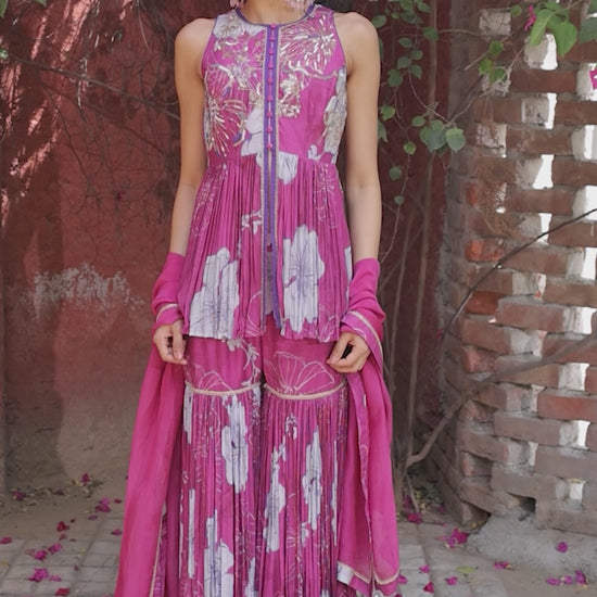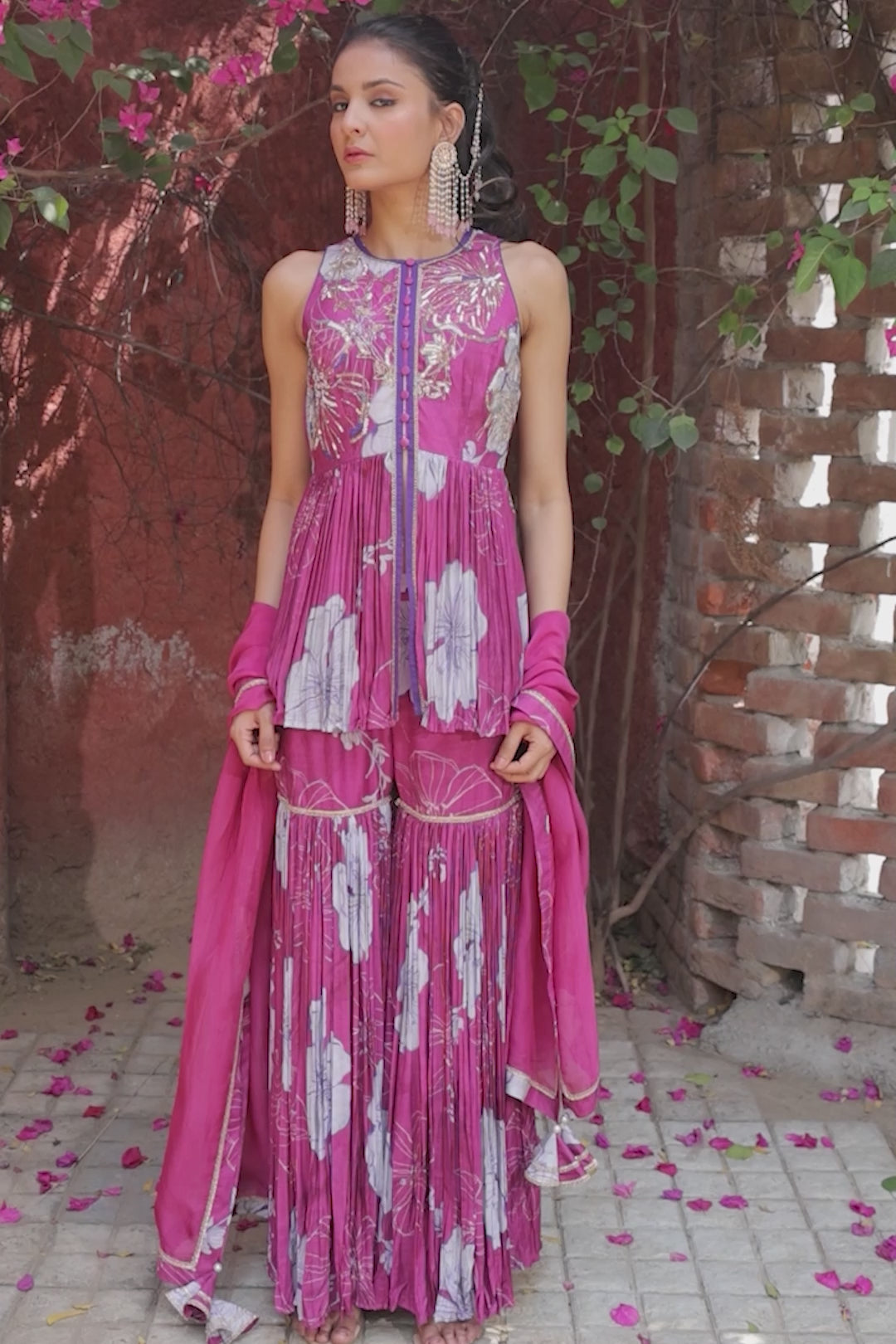 Bold, festive, and effortlessly stylish—the Sangria Peplum Sharara is designed to make a statement. The rich, wine-toned peplum top features flattering cuts and intricate embellishments, perfectly complemented by wide-legged sharara pants that flow with grace. This set brings together traditional craftsmanship with a contemporary silhouette, making it your go-to for celebratory evenings and special occasions.